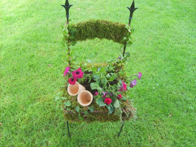 A Gelaste stoel opgemaat met kippengaas, mos, wilgentakken en plantjes klein € 35,00